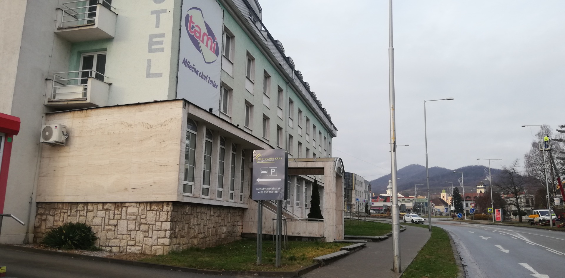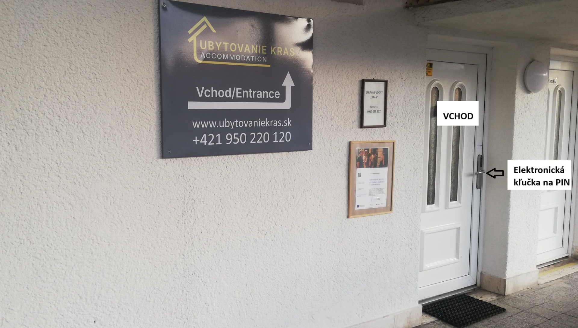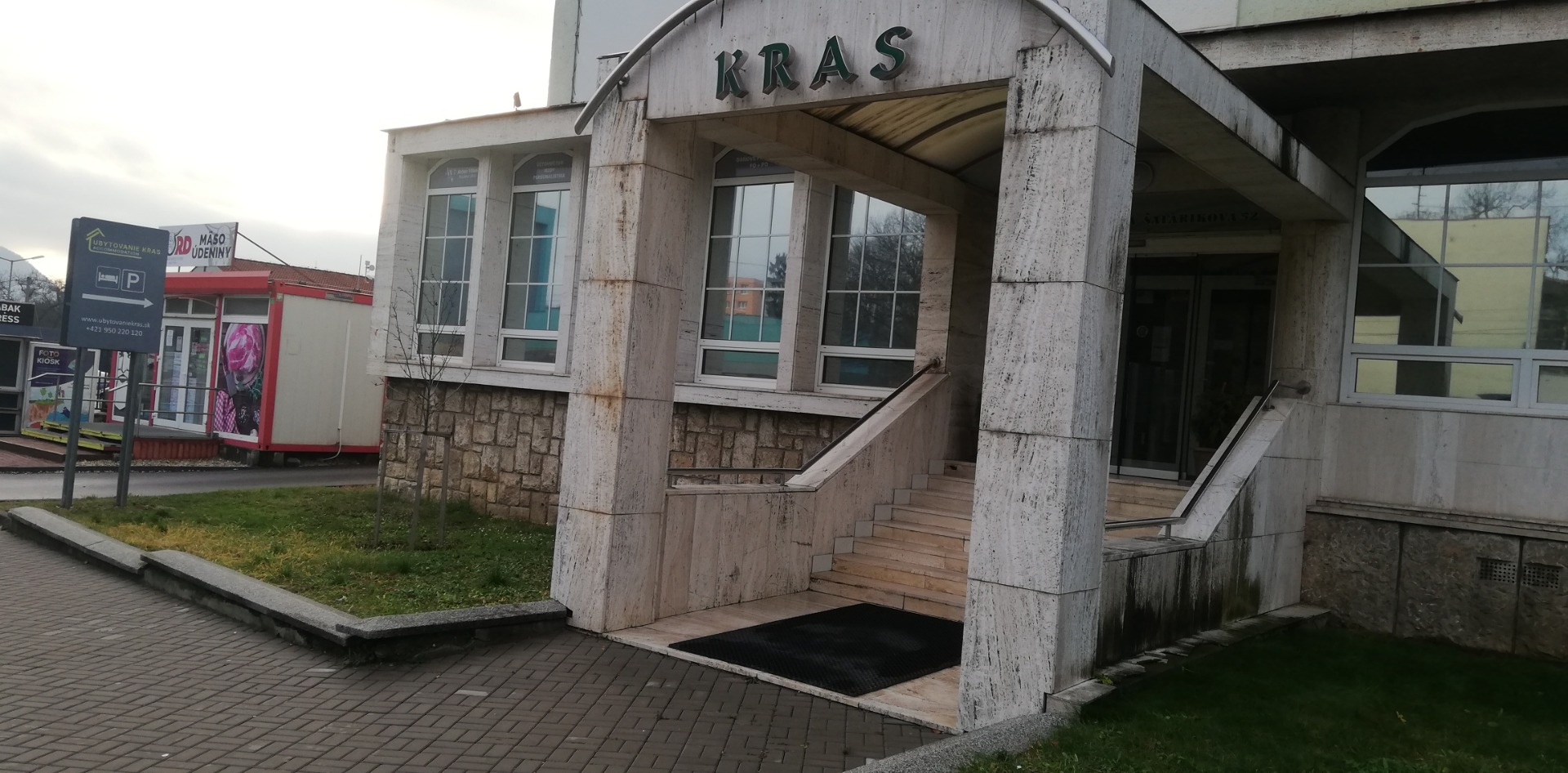 Vchod do budovy "Ubytovania KRAS" z parkoviska.